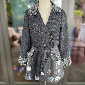 Such a fabulous jacket from SACRED THREADS featuring cute pattern-blocking with different fabrics at the collar and cuffs, the bodice and the skirt of the jacket. Cute flowers all the way around the hemline. Asymmetric zipper.