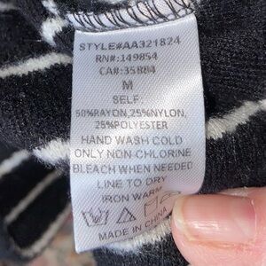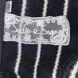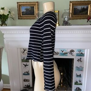 Exposed collar bones and midriff combine with long sleeves for a playful look. Black and white stripes allow this top to match most things in your closet
