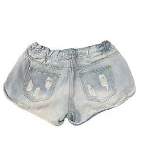 These jean shorts feature a charming floral embroidery in pink and yellow, adding a whimsical touch to the classic denim look. The elastic waistband ensures comfort, while the wide leg openings offer a relaxed fit. Perfect for casual outings, these shorts blend style and ease effortlessly.