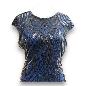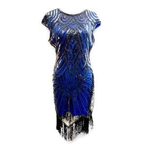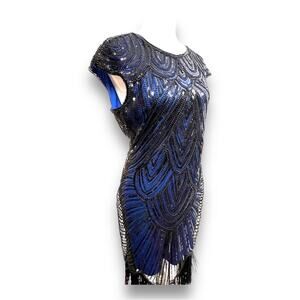 SAFFIRE Blue Black Beaded and sequin COCKTL Dress with fringe hem cap sleeve SM