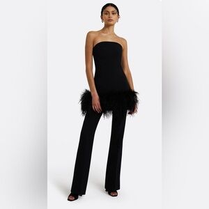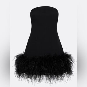 Mini A-line, strapless dress with statement feather trim in black. Styled with the Alexa trousers in black. Fits true to size. Model is 175cm | 5'9'' and wearing a FR36 Heavy Crepe: 92 % Polyester, 8 % Elastane Ostrich Feather: 100% Ostrich Feather