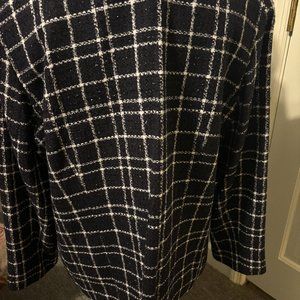 SAG HARBOR LADIES SIZE 18 LONG SLEEVES JACKET/BLAZER. BUTTONS UP. FULLY LINED. BLACK WITH WHITE STRIPES AND BLACK METALLIC THREADS TO GIVE IT A SHIMMER. FAKE POCKETS IN FRONT..88% ACRYLIC, 12% POLYESTER. DRY CLEAN ONLY. PREOWNED BUT LIKE NEW.