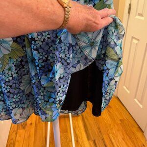 SAG HARBOR blue floral skirt with "bell" like bottom. Drapes beautifully! Size 10P. Left side zipper. Elastic band by the waistline. Black lining. 100% Polyester.