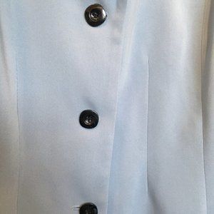 Unique Shawl Collar and sweet rounded split detail at sleeve cuffs. Front princess seams, ventless back hem, padded shoulders. Includes Extra Button. Pix look more gray than this is, it's a lovely robin's egg light blue