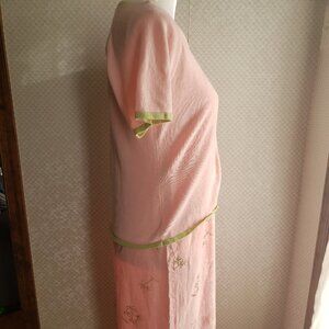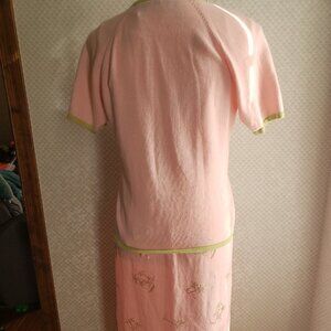 This is slip-on dress with scoop neckline. It has a matching pale pink cardigan with light green trim on neckline and a palm tree on lower right side.