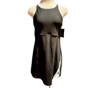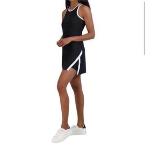 SPLICE RACERBACK ACTIVE DRESS IN BLACK/WHITE Get moving in this sporty racerback minidress constructed from a moisture-wicking interlock knit with contrast banded trim and a shorts liner.