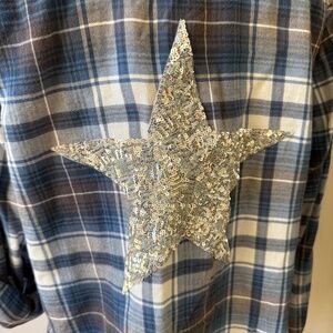 No size tag, fits a size Small, blue and white plaid pattern, snap front, snap flap chest pockets, long sleeves, roll tab snap sleeves, large sequins star on back, boyfriend, western.