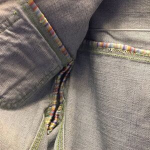 Brand new. Super cute medium wash denim with green stitching. Four pockets on front of jacket with button closures and one small pocket on left arm with button closure.