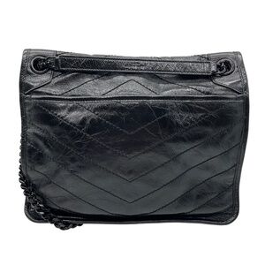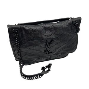 Saint Laurent Black 2021 Niki Medium Crinkled Calfskin Matelasse Leather Monogram Chain Shoulder Bag *Entrupy verified* Condition: Very good condition *In very good condition. Leather has an intentionally vintage and distressed effect. Please see photos. Interior condition: Very good condition *In very good condition. Some signs of wear visible on interior lining. Please see photos. Material: Leather Includes: Entrupy certificate of authenticity, booklets, cards Country of origin: Italy Date / authenticity code: Year 2021 / GNR633184 0921 / 2021 3 07814 633184 0EN08 1000 / 6331840EN08 Measurements: 10.5"L x 5.5"W x 8.5"H Exterior pockets: One open pocket Interior pockets: Two open pockets and one zip pocket Handles: Adjustable shoulder strap Handle drop: 11.5" - 20.5" Closure: Magnetic snap button Interior lining: Black textile fabric Hardware: Black enamel metal and silver-tone Color: Black Category: Bags Subcategory: Handbags Sub Sub Category: Shoulder bags Model: Niki Item Number: 31059-6 GF-925-DI ** Photos are of the actual item ** ** Roundabout Couture Certified Authentic **
