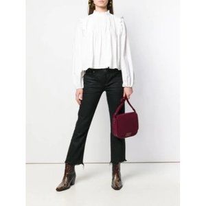 Leather logo applique and patch pocket at interior. Tonal suede lining. Antiqued gold-tone hardware. Approx. 9" length x 8" height x 3" width.