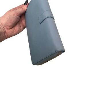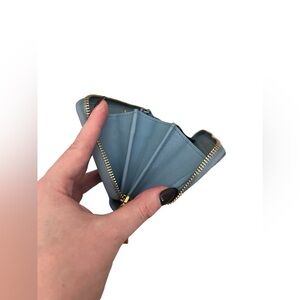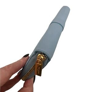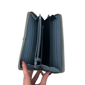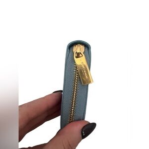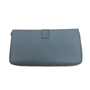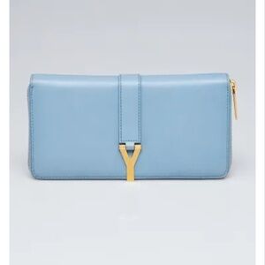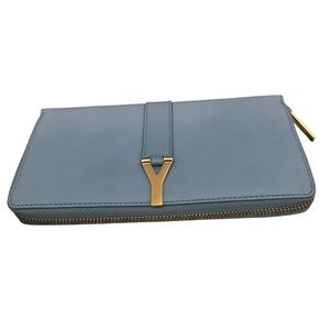 This Yves Saint Laurent Bleu Glacier Calfskin Leather Classic Y Zip Wallet is a glamorous way to organize your essentials such as your bills, credit cards and plenty of change. It is made of calfskin leather and plenty of room to hold all of your cards, currency and change. The goldtone classic Y detailing adds style and sophistication. Perfect if you're seeking something chic and practical. Retail price $645.
