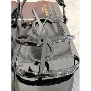 SAINT LAURENT Cassandre YSL Logo Flat Patent Leather Sandals