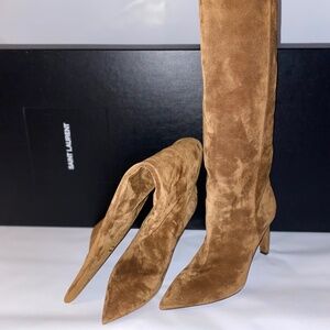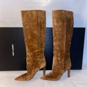 NEW in box! Kate 85 Saint Laurent boots in camel suede.Heel covered in suede with a height of 3.4 inches 8,5 cm. Pointed toe.Leather sole.Made in Italy. These have a slouch style to them. Very buttery soft suede and interior. The heel is very sturdy and comfortable. This style is timeless. Can wear over jeans or with a skirt, it’s very versatile. The size is 39 EU. US 8 1/2-9 women’s. They go up just about the knee. Great for any calf including wide.