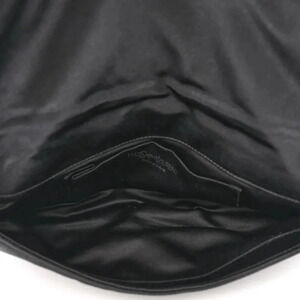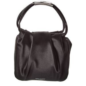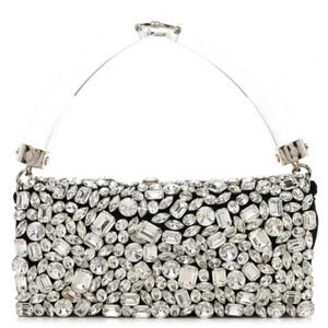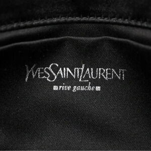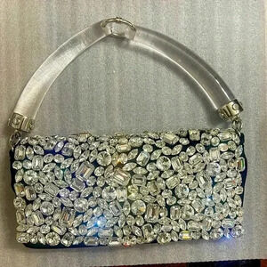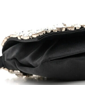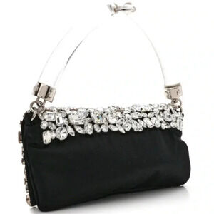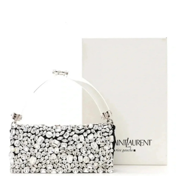 AUTHENTIC SAINT LAURENT. SATIN JEWELED CLUTCH IN BLACK & SILVER. VINTAGE CLUTCH IS CRAFTED OF BLACKL SATIN WITH JEWELED EMBELLISHMENTS THROUGH OUT W/ A SILVER HARDWARE AND A TRANSLUCENT RESIN HANDLE. FLAP OPENS TO BLACK SATIN INTERIOR W/ A PATCH POCKET