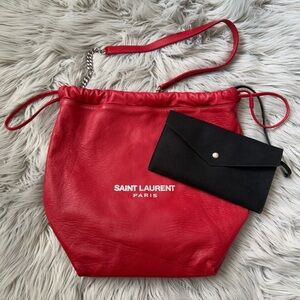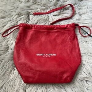 SAINT LAURENT Lambskin Teddy Bucket Bag in Red. Great Condition- minor signs of wear; has some minor marks/scuffs and creased leather. Please review all photos. Comes with dustbag