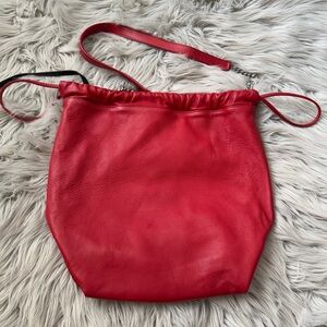 This classic bucket shape is crafted of rich smooth lambskin in red. The bag features a drawstring top and a chain and leather shoulder strap. The top opens to a spacious black fabric interior with a pouch.