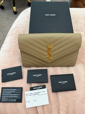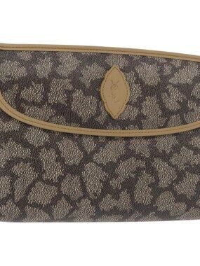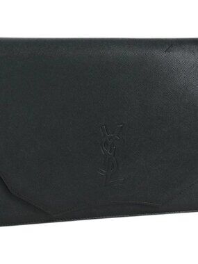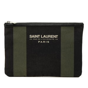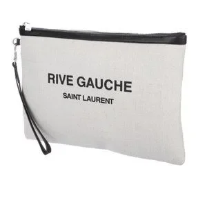 Saint Laurent Rive Gauche pouch with silver-tone hardware, black leather trim, single flat optional wrist strap, black grosgrain lining, single slit pocket at interior wall and zip closure at top. Includes dust bag/Box.
