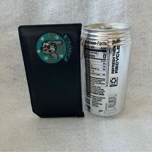 dusty inside, smells like coins on inside of zippered pocket, outline of cards can be seen on the front side where cards were, scratches on leather, hasn't been used in a few years