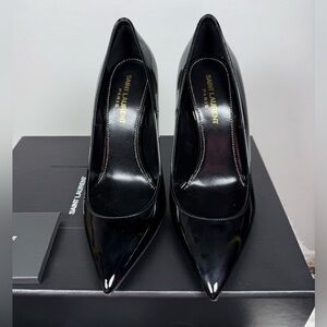 Elevate your style with these Saint Laurent black patent leather heels. Perfect for any occasion, these shoes offer a sleek and sophisticated look.