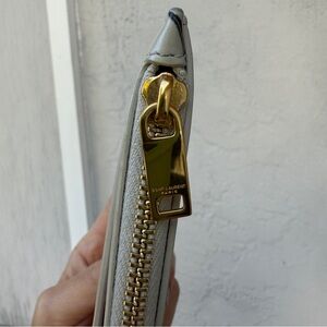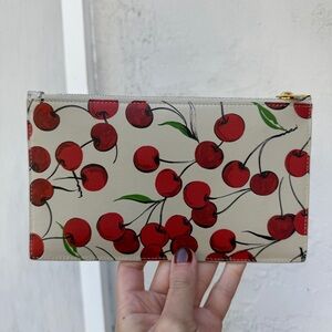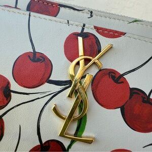 Monogram Cherry Print Zip Bill Pouch. This petite pouch is crafted of smooth calfskin leather in white with decorative cherries. The case features a prominent gold YSL logo on the front.