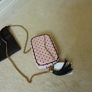 Polka dots add playful charm to a calfskin camera bag featuring antiqued monogram hardware, contrast piping and a swingy tassel.