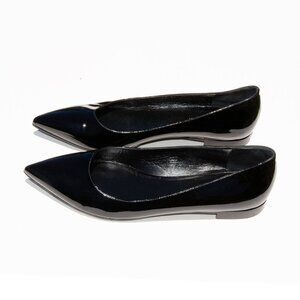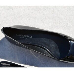 Authentic SAINT LAURENT 10 black patent leather ballet flats. Elongated vamp and pointy toe; tonal stitching, stacked heel. Black leather lining and insole; black leather outsole, rubber grip soles have been added. Excellent pre-owned condition. Worn only a few times; very light creasing to the patent at the vamp from normal bending at the foot. Made in Italy. Size 40 but please know your size in this designer and check measurements below to ensure fit. I purchased these in the wrong size (my size is 39), hence the very little wear. My loss, your gain ;) Retails $595
