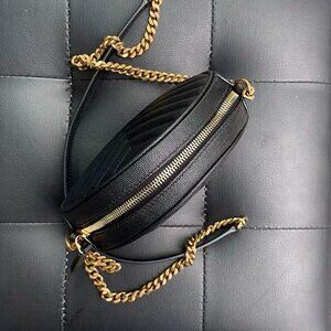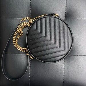 SAINT LAURENT YSL Vinyle gold logo chain quilted cowhide leather small round crossbody shoulder bag for women, black.