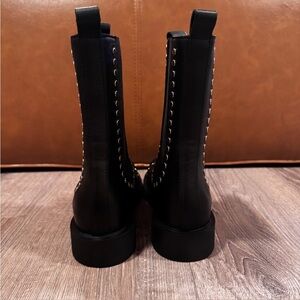 Crafted from premium black leather, these boots feature a chic design with silver stud detailing along the sides and front, adding a bold yet sophisticated touch.