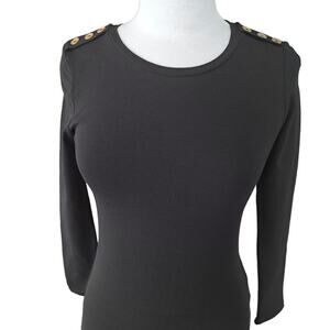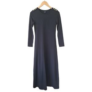 Fitted slimming organic cotton maxi dress. Slim fitting. Crew neck, epaulette inspired button detail on shoulder.