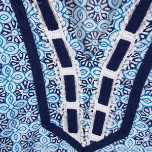 SAINT TROPEZ WEST Womens Top Small Blue Floral Pullover Tunic Crochet Woven Trim