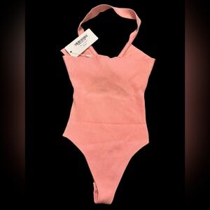 Stylish pink halter top bodysuit with a front adjustable tie. Perfect for casual outings. Very soft knit bodysuit with snaps. Peek-a-boo cut-out , brand new with tags!