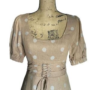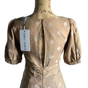 Elevate your wardrobe with this stunning SAINTS + SECRETS brown polka dot midi dress. The feminine A-line silhouette flatters any figure while the puff sleeves add a touch of whimsy. Perfect for any occasion, this dress is brand new with tags and sure to turn heads. Available in size small, it's a must-have for any fashion-forward woman.
