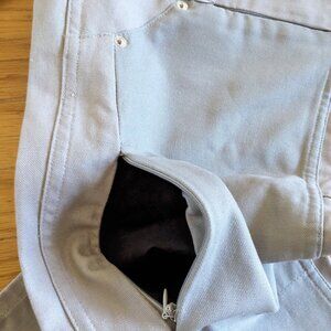 SAINTWOODS Montreal Streetwear brand unisex workwear style pants. Brand new, unworn condition, without tags. Lightweight 12 oz cotton duck canvas fabric in light taupe gray with darker taupe grey tonal contrast knees. Double knee panels have zips with hidden pockets, additional utility pockets, custom metal hardware and rivets, hammer loop, rubber SAINTWOODS custom patch on knee, zip fly. 28” waist, 31.25” inseam. Straight, slim-cut legs.