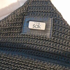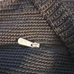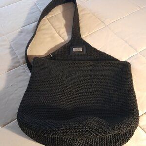Bag is in excellent condition with zipper closing and one zippered outside pocket. Bag is knit look, but material is may be synthetic and repels water. Bag measures 11" w x 12"h x. 4"d.