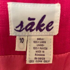 Vintage Sake 100% linen sheath dress. Dress is sleeveless, V-neck, full button front with beautiful gold buttons. Fushia color in size 10. Lining is 100% rayon. Excellent like new condition.