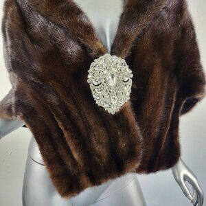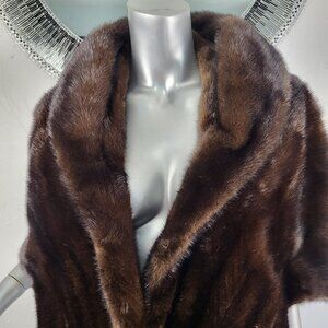 SAKOWITZ~VINTAGE~S/M/L~BROWN RANCH MAHOGANY GENUINE REAL MINK FUR STOLE COAT~SOFT GLOSSY FUR. SLIT POCKETS. NO FRONT CLOSURE. BROOCH NOT INCLUDED. FITS SIZE SMALL, MEDIUM AND LARGE. DOES HAVE A MONOGRAM. VERY GOOD CONDITION. BEAUTIFUL ON.