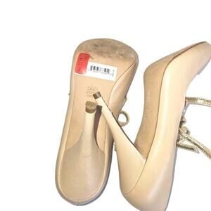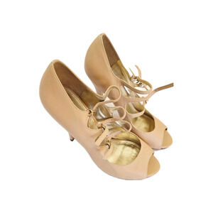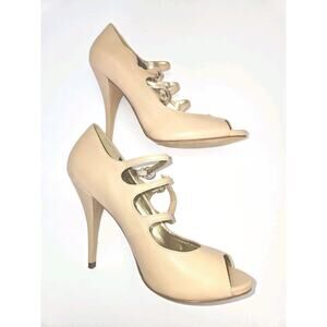 SAKS FIFTH AVENUE Aida Beige Nude Leather Strappy Peep Toe Heels Sz 8.5M