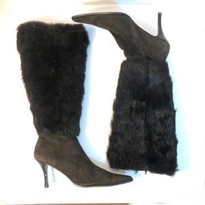 SAKS FIFTH AVENUE Dark Brown Rabbit Fur and Suede Knee High Boots