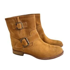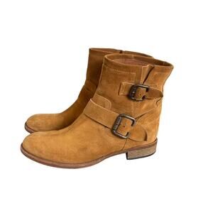 SAKS FIFTH AVENUE MADE IN ITALY SUEDE CAMEL BROWN BUCKLE MOTO BOOTS SZ. 7.5