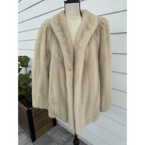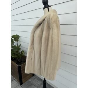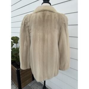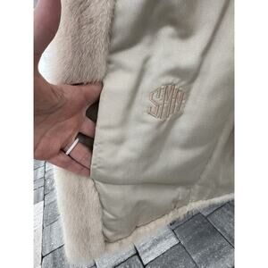The SAKS FIFTH AVENUE Revillon Vintage Mink Fur Coat is a luxurious and stylish outerwear piece perfect for outdoor occasions. This one-size coat features a beautiful cream and tan mink outer shell with a satin lining, providing both warmth and elegance. With a hook and eye closure and convenient pockets, this coat is lightweight enough for all seasons and boasts a glam, bohemian theme that is perfect for adding a touch of vintage flair to your look. Made in the United States, this coat is sure to make a statement and exceed your expectations with its excellent condition and 100% money-back guarantee.