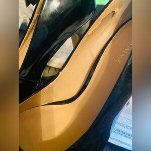 SAKS FIFTH AVENUE BLACK HEELS. As you can see from the bottom and heels, they have not been worn just stored a long time. However, they have peeling on the insides as seen in last couple of pictures.