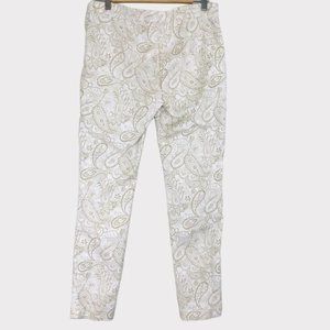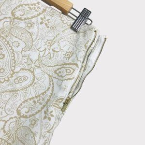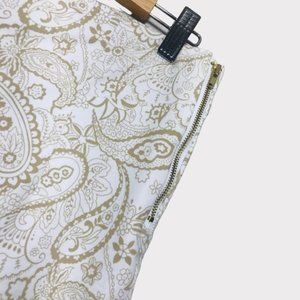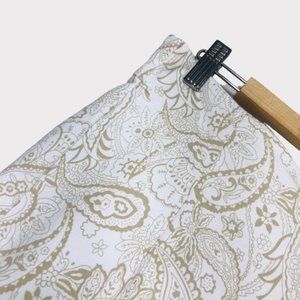 Lovely white and light golden paisley details. Looks great with a camel sweater, trench coat or white tee.