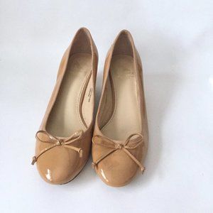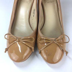 Beautiful Camel Beige Ballet Wedges by SAKS FIFTH AVENUE. Ballerina style. Decorative bow. Round toe. Very comfy!