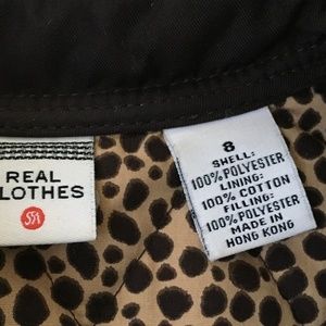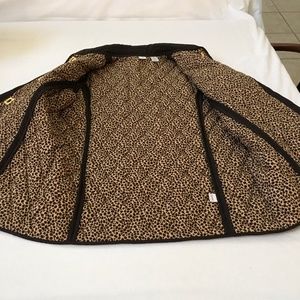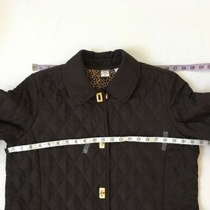 Excellent, like new condition- only worn a few times. No flaws detected. Light/medium weight polyfill quilted jacket with two front pockets and shiny gold turn lock front closures. Color is like a chocolate brown. Cheetah animal print lining. Relaxed, over sized, boxy fit. Women’s size 8, but seems to run big based on chest measurement. Measurements in photos.