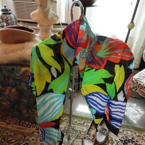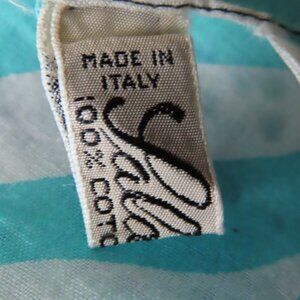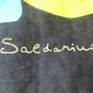 BRIGHT AND BOLD FROM ITALY, IT MEASURES ABOUT 61 INCHES LONG AND IS CERTAINLY AN EYECATCHER, LABEL AS SHOWN, MADE IN ITALY, SALDARINA...I NOTICED SPOTS THROUGHOUT NOT SURE IF ITS PART OF THE DESIGN OR PERHAPS IT WAS WASHED ONCE AND COLORS CAME OFF I JUST DONT KNOW, BUT DUE TO THAT, I AM PRICING IT LOWER THAN I WOULD FOR A SALDARINA LIKE THIS IN GREAT CONDITION....ITS STILL GOOD CONDITION AND ITS SIGNED ON FABRIC WHICH IS 100 PER CENT COTTON ALONG WITH LABEL.