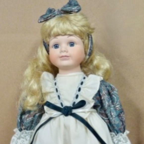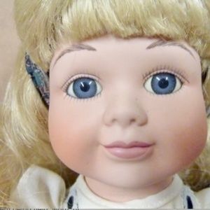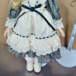 This blonde beauty is about 17" tall with a teal/green and burgundy paisly dress with a cream apron/smock adorned with lace and ribbon and matching bloomers. The cream material has some fading/discoloration on the bloomers (the part that shows, not under the dress). The smock has a small stain on the back which would probably come out if it was washed. She has a matching head band with a bow. Her head, forearms and legs (to the knee) are porcelain. Glass eyes. She is in very good condition with no major scratches or markings that I can see. Shoes are a leather-type material. Socks go to the knees and are a cream colored knit. Dress and headband have velcro fasteners.