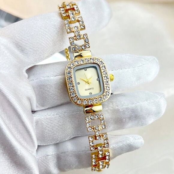 SALE 18k Gold Filled Chain Block Quartz Crystal Wrist Watch