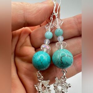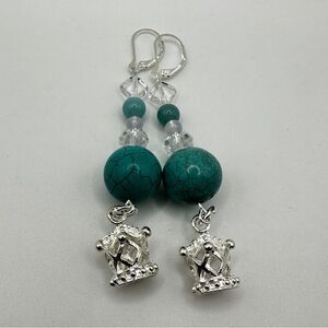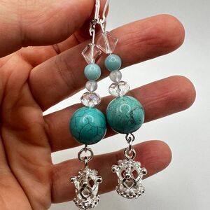 They have nice 14mm red faux turquoise beads, glass diamond beads, Aurora Borealis faceted crystal bead, 4mm blue moonstone beads, and an unknown 6mm blue stone bead. There's a gorgeous crown charm dangle at the end!