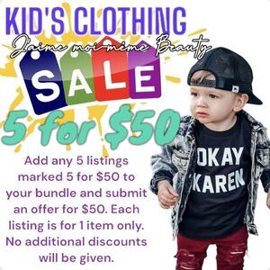 Want a better price? Bundle 5 items items (no more than 5 per bundle due to Poshmark weight limitations) marked 5 for $50 in kid's clothing and send an offer for $50. Shipping/tax are additional.