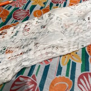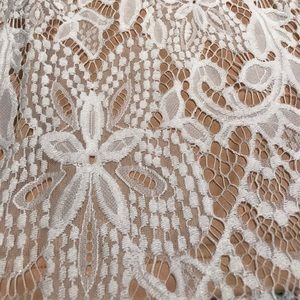 White lace dress with gold slip underneath. Sleeves are lace and see through. The dip is on the back.